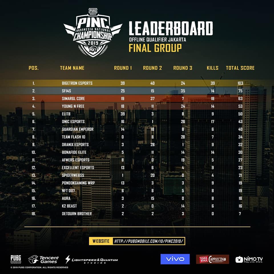 Meski gagal meraih chicken dinner di ronde ketiga namun raihan kill Bigetron yang mencapai 39 sudah lebih dari cukup untuk memastikan mereka sebagai juara kualifikasi PINC Jakarta dengan total raihan 103 poin.