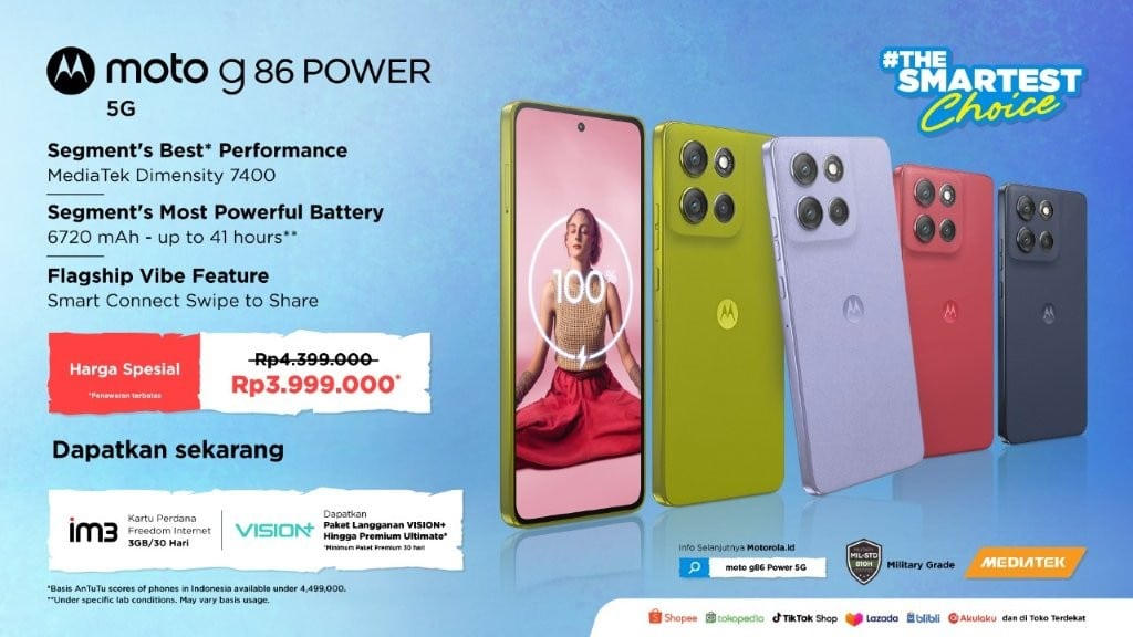 moto g86 power 5G tersedia dengan 8GB RAM + 256GB storage seharga Rp3.999.999. Setiap pembelian dilengkapi kartu perdana IM3 Freedom Internet 3GB* dan kesempatan berlangganan Vision+ Premium Ultimate 30 hari.
