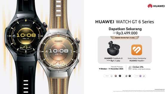 Selama periode promo launching pada 9 Oktober hingga 11 November 2025, Huawei menawarkan HUAWEI WATCH GT 6 secara online dan offline dengan harga spesial mulai dari Rp3.499.000 untuk varian basic, serta mulai dari Rp4.599.000 untuk varian GT 6 Pro.