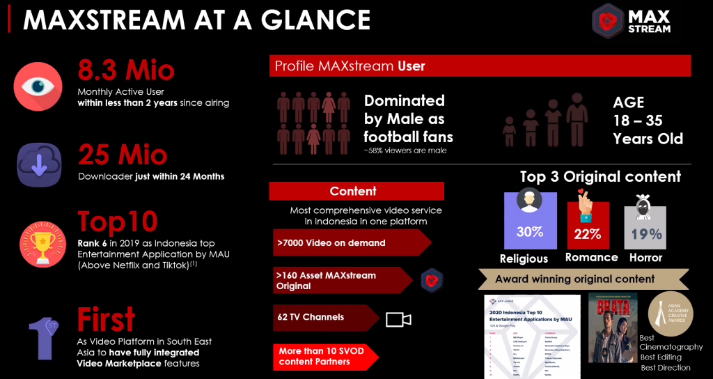 Kehadiran ragam tayangan terbaru ini akan semakin memperkaya pilihan konten di dalam MAXstream, yang dapat dinikmati kapanpun dan dimanapun. Sebelumnya, berbagai platform over-the-top (OTT) telah hadir di dalam ekosistem MAXstream, seperti HBO GO, iflix, Vidio, dan VIU. Secara keseluruhan, MAXstream telah menyediakan 60 saluran televisi, baik lokal maupun internasional, 13 platform OTT, dan lebih dari 10.000 koleksi video (film dan serial). Saat ini, MAXstream telah diunduh sebanyak lebih dari 30 juta kali di Play Store serta App Store, dan mencatatkan sekitar 55 juta menit waktu menonton per bulannya.