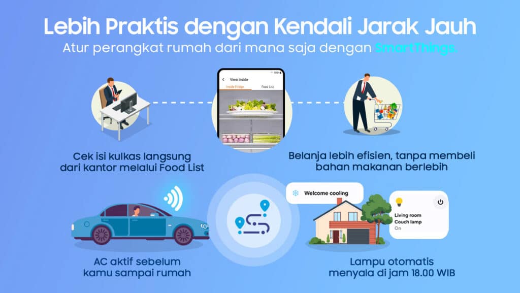 Bagi masyarakat modern dengan mobilitas tinggi, kendali jarak jauh menjadi fitur penting. Melalui aplikasi SmartThings, pengguna dapat menyalakan pendingin udara atau air purifier bahkan sebelum sampai di rumah. Dengan demikian, kondisi rumah selalu siap menyambut penghuni dengan suasana nyaman.