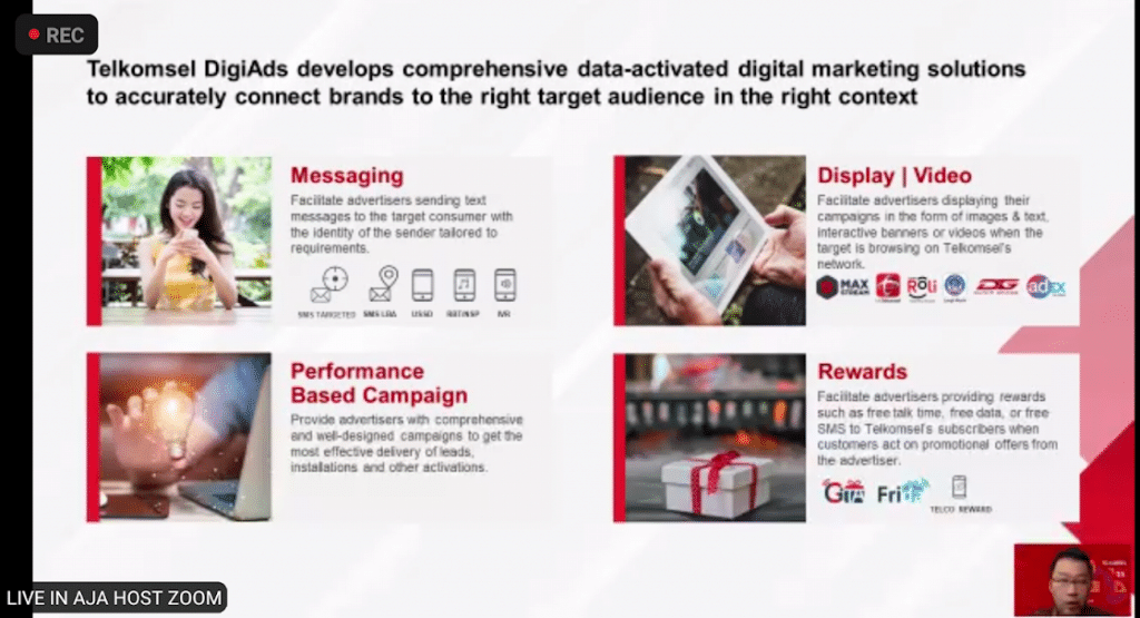 - Melalui empat pilar produk utama, yaitu Messaging, Display, Rewards, dan Banking, Telkomsel DigiAds menghadirkan layanan-layanan inovatif seperti ROLi yang memberikan pengalaman berbeda bagi pelanggan dalam berinteraksi dengan pesan dari perusahaan.